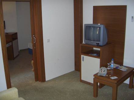 Wohnbereich, Minibar mit TV, links Türe zum zweiten Zimmer