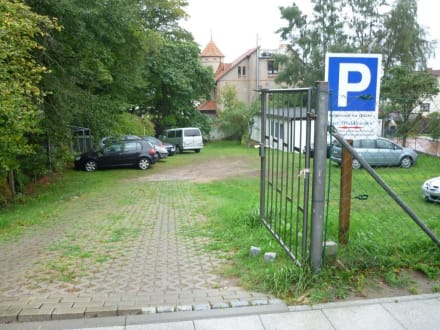 Diese Bild zeigt einen Teil des "Parkplatzes". Es handelt sich dabei um eine ungemähte Wiese mit schräger Auffahrt zur Straße. Leider haben sich im Laufe der Zeit recht tiefe Löcher vor dem Steinbelag gebildet.