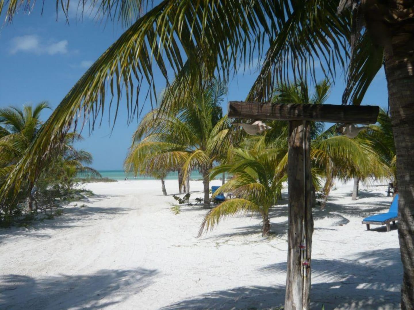Strand mit Muscheldusche und Liegen