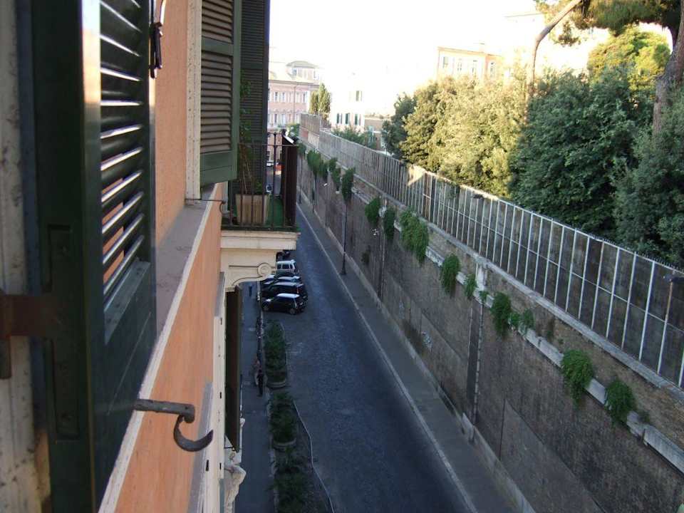 Blick aus dem FensterBlick nach links in die ruhige Seitenstraße. Gegenüber ein Verwaltungsgebäude mit Mauer.