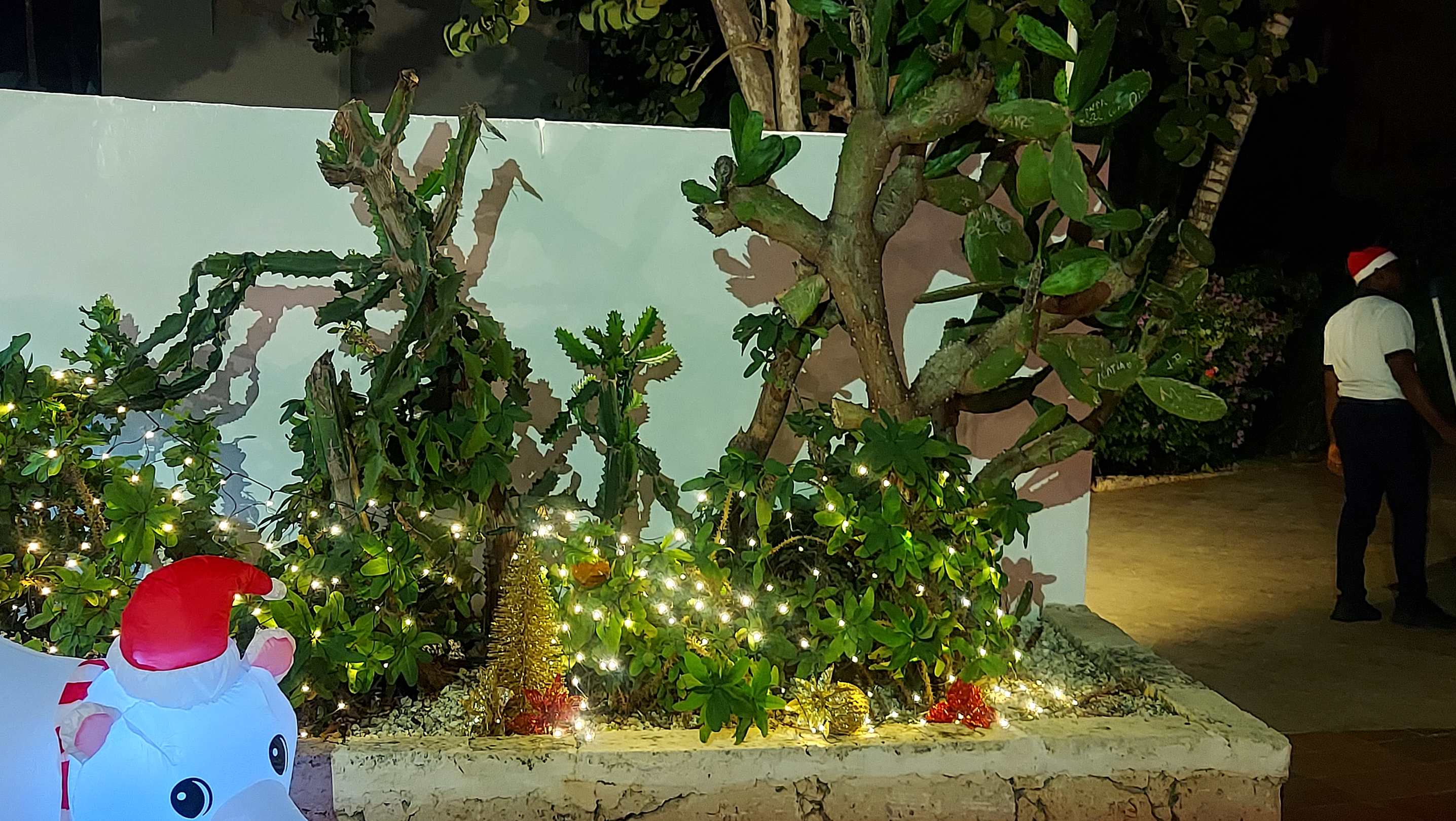 Weihnachtlich geschmückte Kakteen vor dem mexikanischen Restaurant