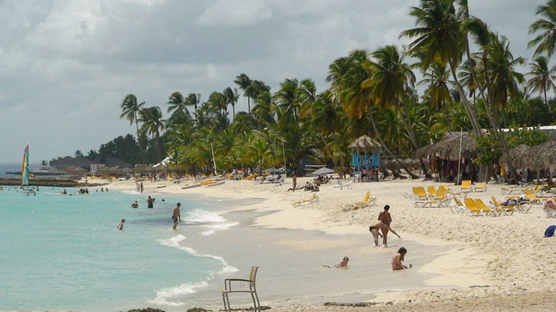 Das Bild zeigt den Hotelstrand am Viva Pallace vom Leuchtturm (Beachbar des benachbarten Iberostar Hacienda) aus gesehen und mit den auch für Gäste des Beach nutzbaren Wassersportmöglichkeiten.