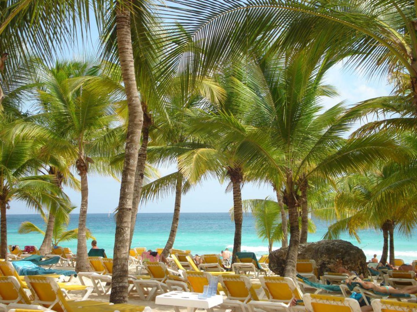 Ausblick von einer Sonnenliege am Strand aus dem Schatten einer Palme