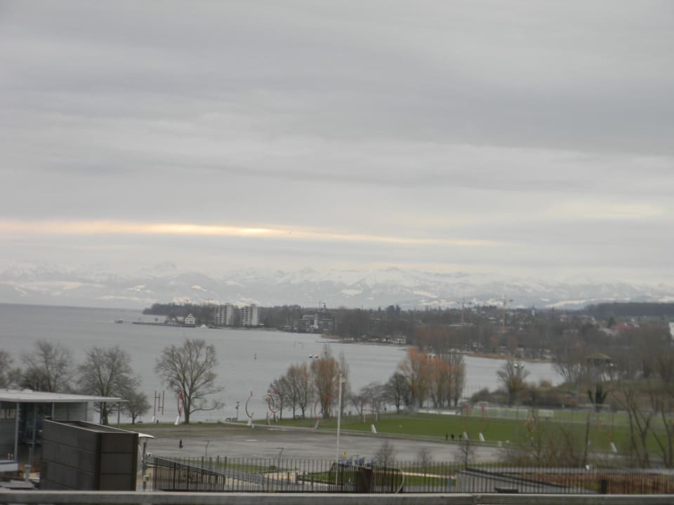 Blick vom Frühstücksraum auf See und AlpenEin einmaliger Anblick den man beim Frühstück geniessen kann.