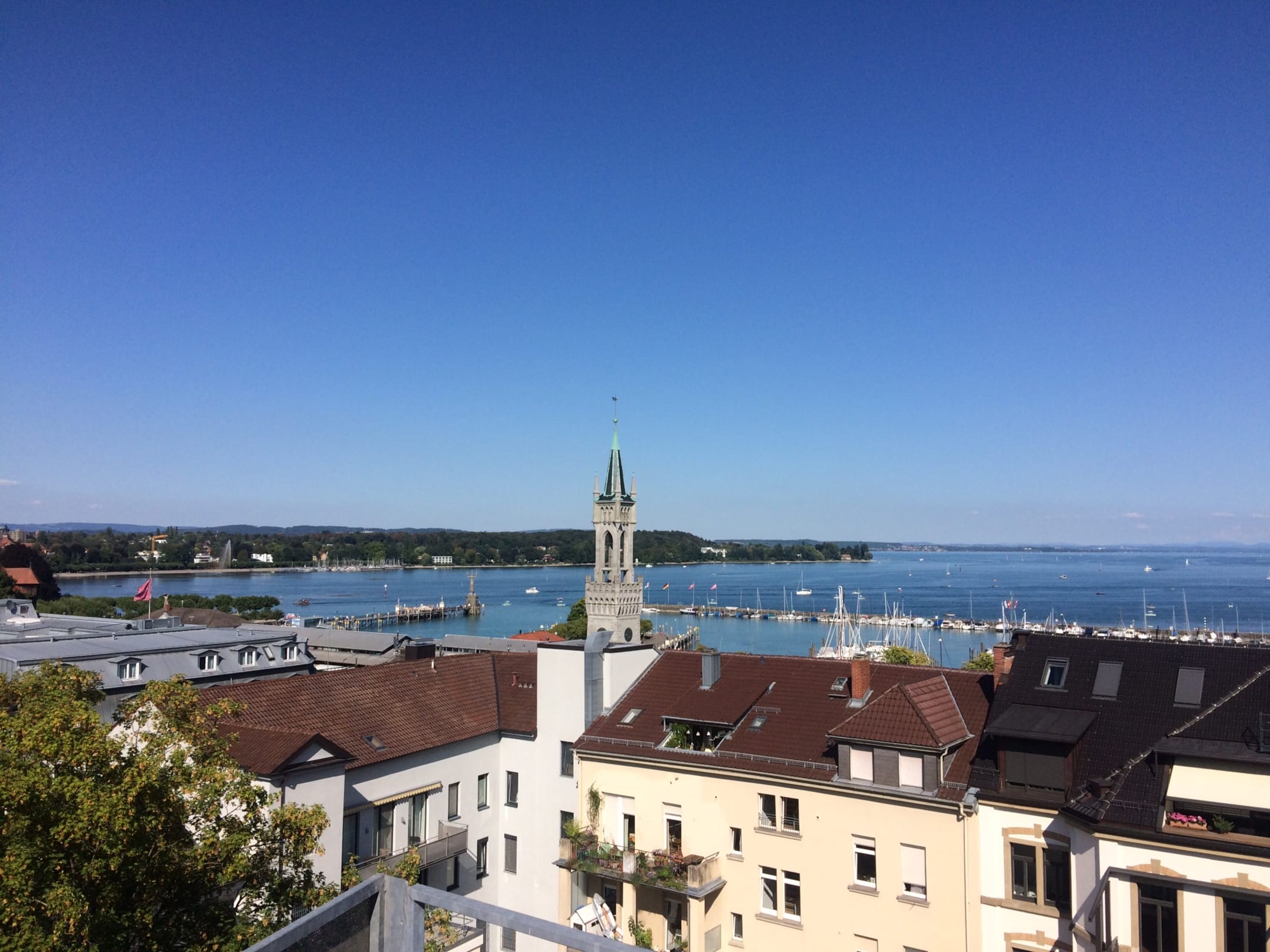 Ausblick von der Frühstücks- bzw. Dachterrasse mit Bahnhofsturm und Hafen