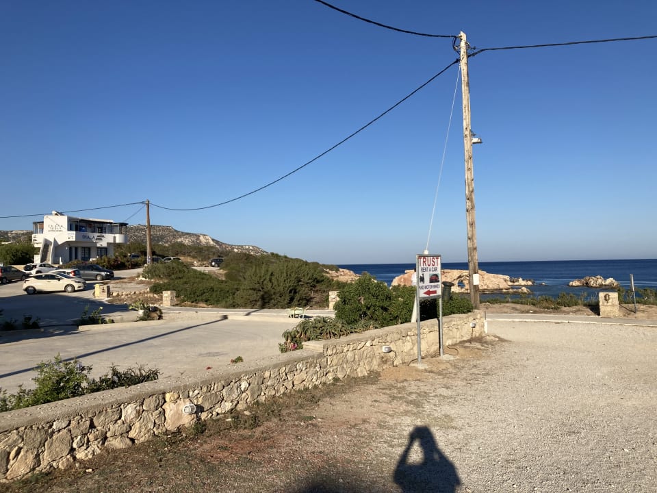 links ist das Cafe Skala- voll super. Vorne geht man hinunter zum Strand-Steine.