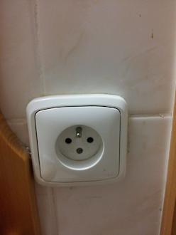 Verdreckte Steckdose neben dem Spiegel am Waschtisch
