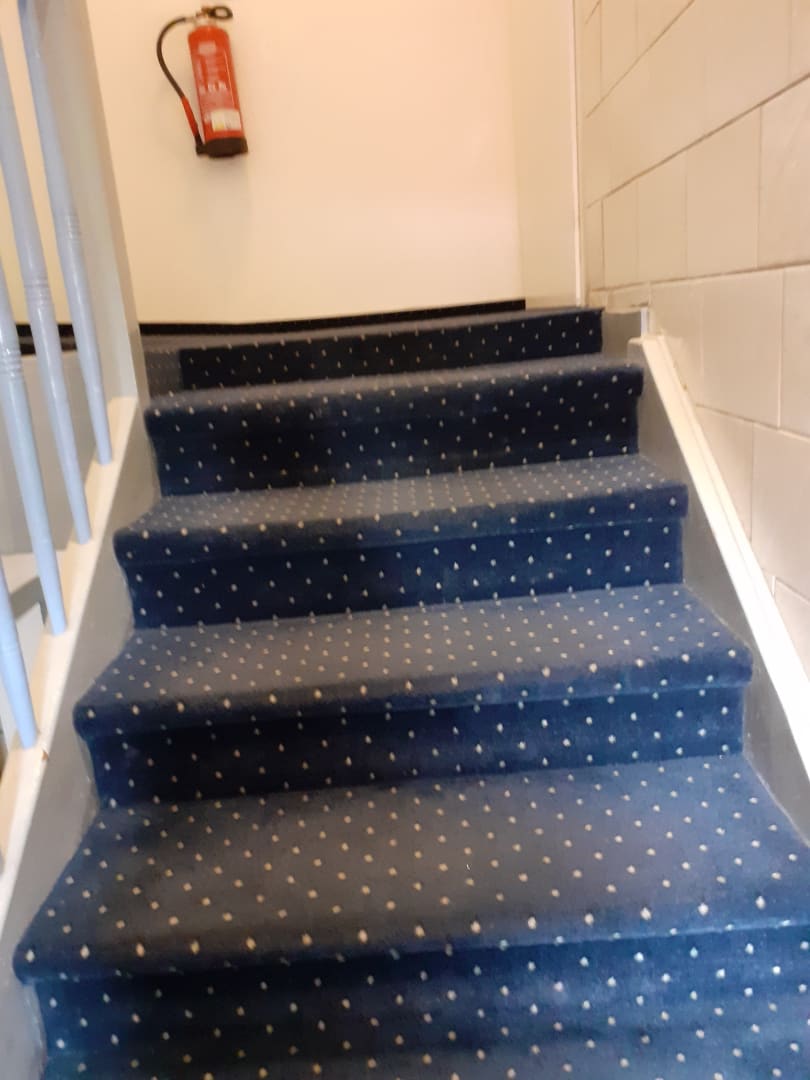Die Treppe ins 2.Obergeschoss ...eine Stolperfalle, die nicht gekennzeichnet ist. Ich habe die letzte, kleine Stufe übersehen und bin mit voller Wucht auf mein Knie gefallen