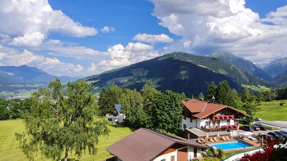 Außenpool und Blick ins Untertal und zur Planai.