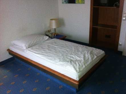 Das Bett, in dem Regal oben der TV