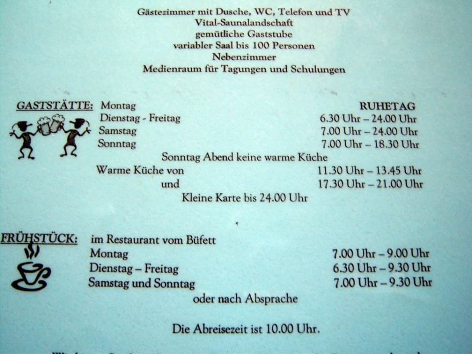 Sehr erstaunlich sind die Zeiten im Hotel - Check out bis 10.00 Uhr, Frühstück unter der Woche bis 9.00 und am Wochenende bis 9.30 Uhr - und das bei 3,5 Sternen ...