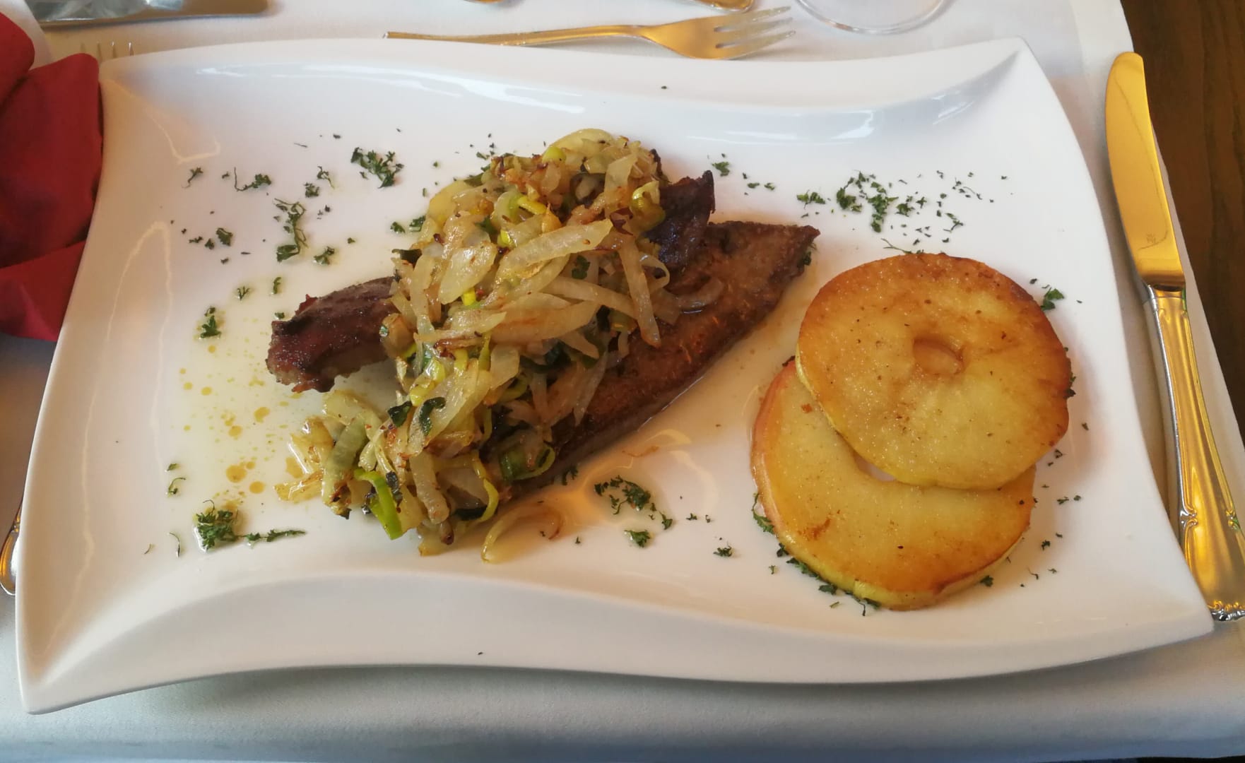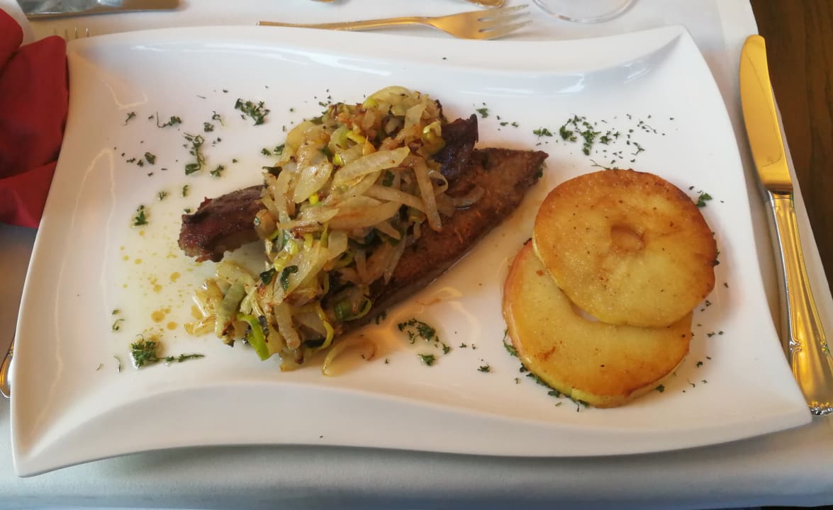Kalbsleber mit Kartoffelstampf, Apfelringe und Zwiebeln