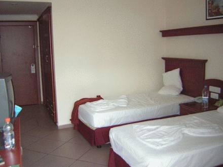 ZimmerDas war unser wunderschönes Hotelzimmer. Die Betten werden jeden Tag so oder so ähnlich wie auf dem rechten Bett zu sehen ist, geschmückt.