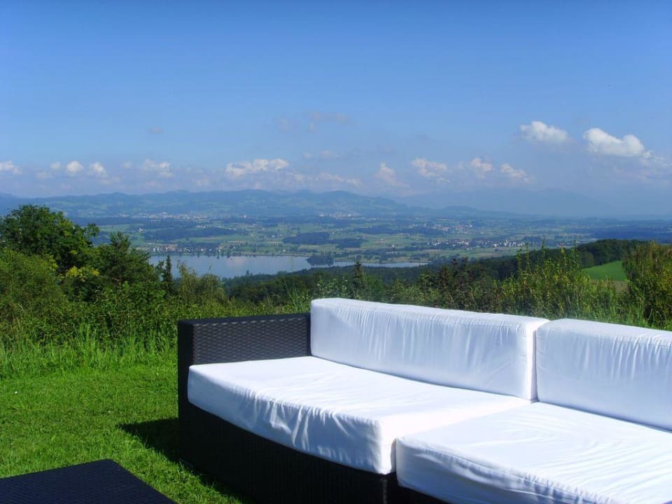 Wenn man Glück hat, erwischt man ein paar gemütliche Lounge-Möbel im Garten des Hotel-Landgasthof Wassberg und kann den Ausblick geniessen.