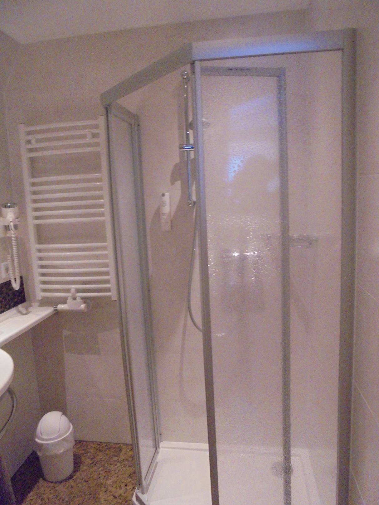 Die fast bodengleiche Dusche steht auf dem Selben. (Lässt sich nicht mehr drehen.)
