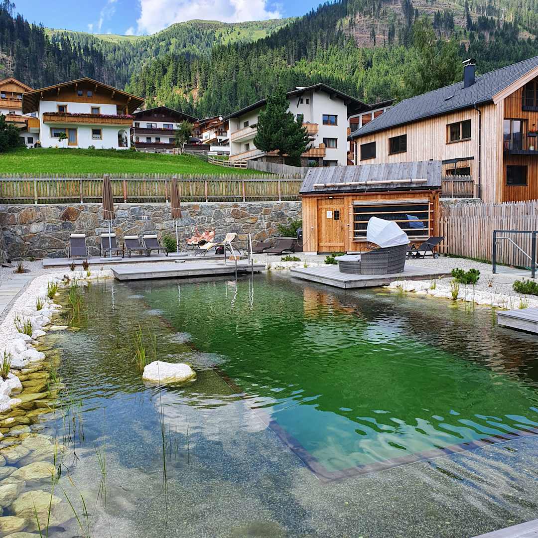 Pool mit Sauna und Dusche im Hintergrund