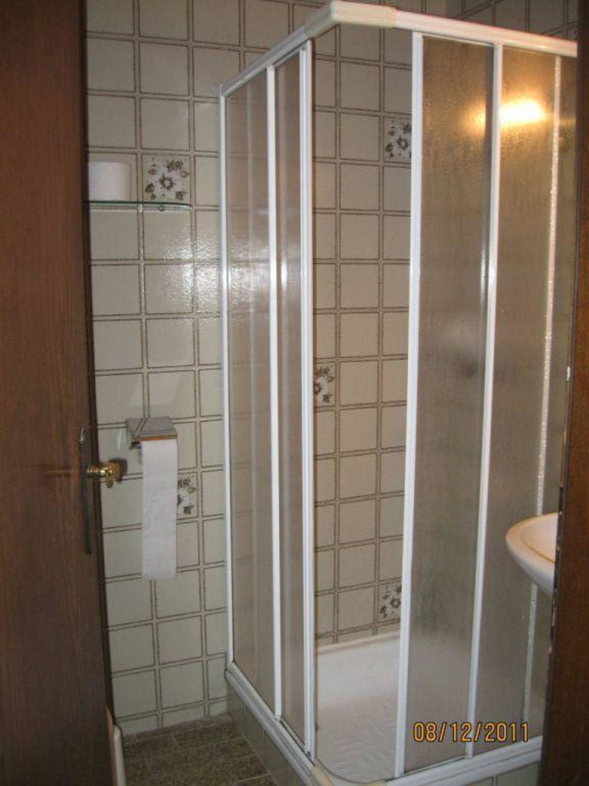 Das eher düster anheimelnde Bad. Rechts von der Dusche befindet sich ein kleines Waschbecken und links (hinter der Tür) versteckt sich die Toilette. Halt alles sehr beengt.