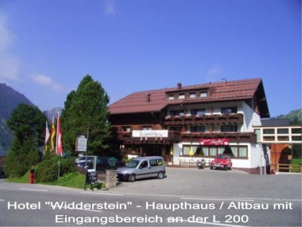 Eingangsbereich des Hotel WiddersetinEingang zum Hotel im Altbau mit vorn gelegenem kleinen Parkplatz. Hotel liegt direkt an die viel befahrenen L 200 (Durchgangsstraße). Wir hatten das Zimmer im Neubau - dort hört man vom Verkehr nichts. Wie es nach vorn im Altbau ist kann ich nicht beurteilen.