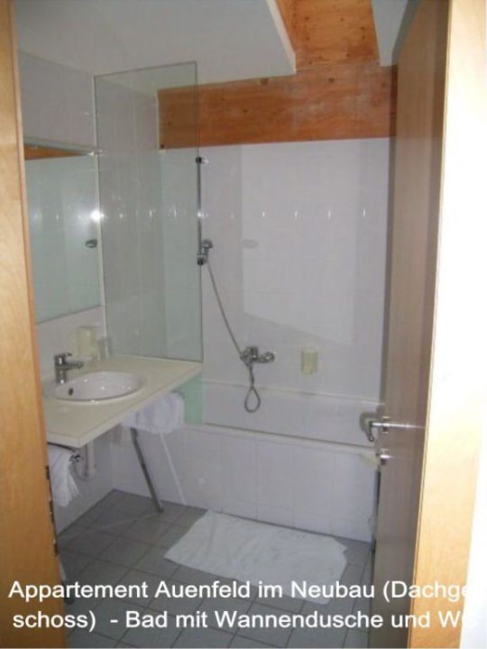 Appartement im Haus Auenfeld (Neubau) - BadDas Foto zeigt einen Teil unseres Apartments im Dachgeschoss des Neubaus. Das Apartment war fast 60 qm groß und auch nach oben hin sehr hoch. Das Dachgeschoss ist zu empfehlen, da dort statt 6 nmur 4 (größere) Apartments gelegen sind. Unser Apartment hatte einen Flur mit Garderobe und Kochnische, ein Bad mit WC, ein separates Schlafzimmer mit Doppelbett, einen großen Wohnraum mit zwei Zustellbetten / Eßtisch / Couch mit Beistelltisch und einen großen Balkon mit Tisch / 2 Stühlen / 1 Liegestuhl