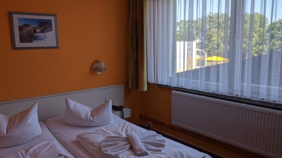 Zimmer 220 mit "Blick aufs Dach", überall nachgestrichen, Heizungsrohre blank etc.