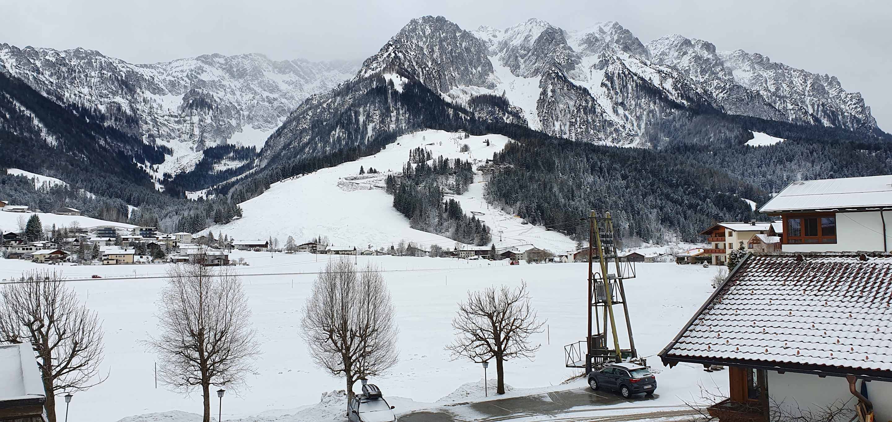 Blick aus dem Zimmer aufs nahegelegende Skigebiet (zahmer Kaiser)