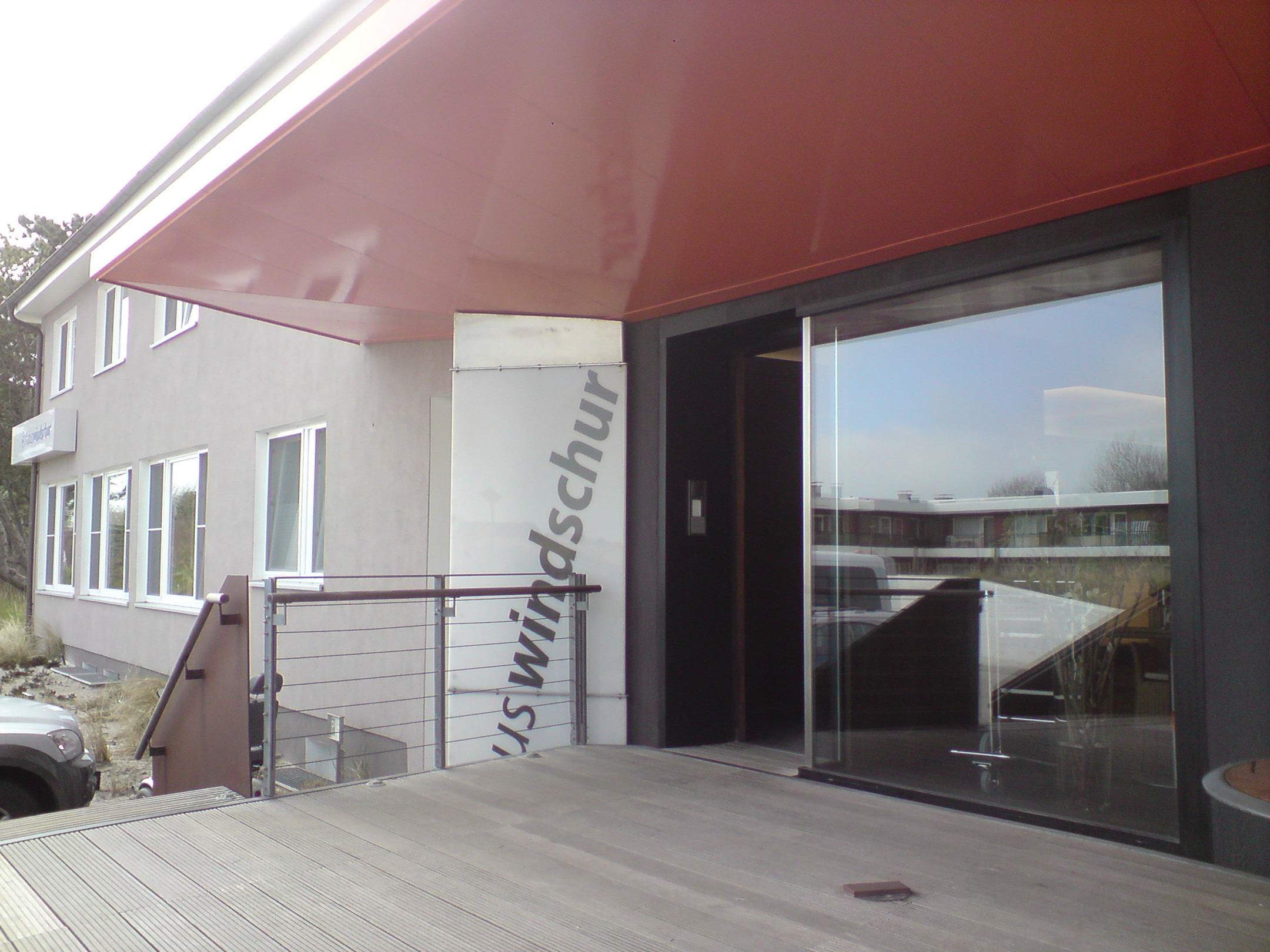 Der Eingang ist über die Terrasse über ein paar Stufen erreichbar. Links daneben steht ein gläserner Fahrstuhl zur Verfügung, mit dem sowohl die Rezeption als auch die weiteren Etagen erreichbar sind.