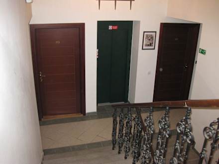 Hausflur des Hotels mit Blick auf den FahrstuhlAlle Zimmer und die Eingangstür des Hotels lassen sich nur mit Hilfe einer Magnetkarte öffnen.