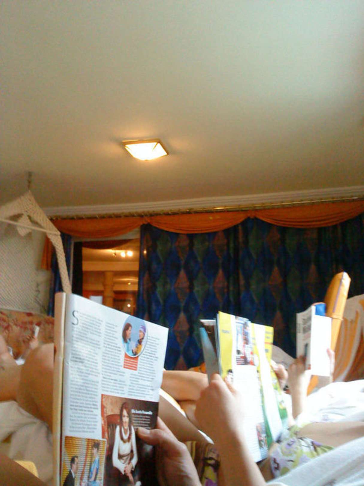 Blick Richtung Tee/Wasserbar...hinter dem blauen Vorhang...seitlich ein geknüpfter Hängesessel mit roten Kissen, passend zu den orangen Liegen und blauen Vorhängen....