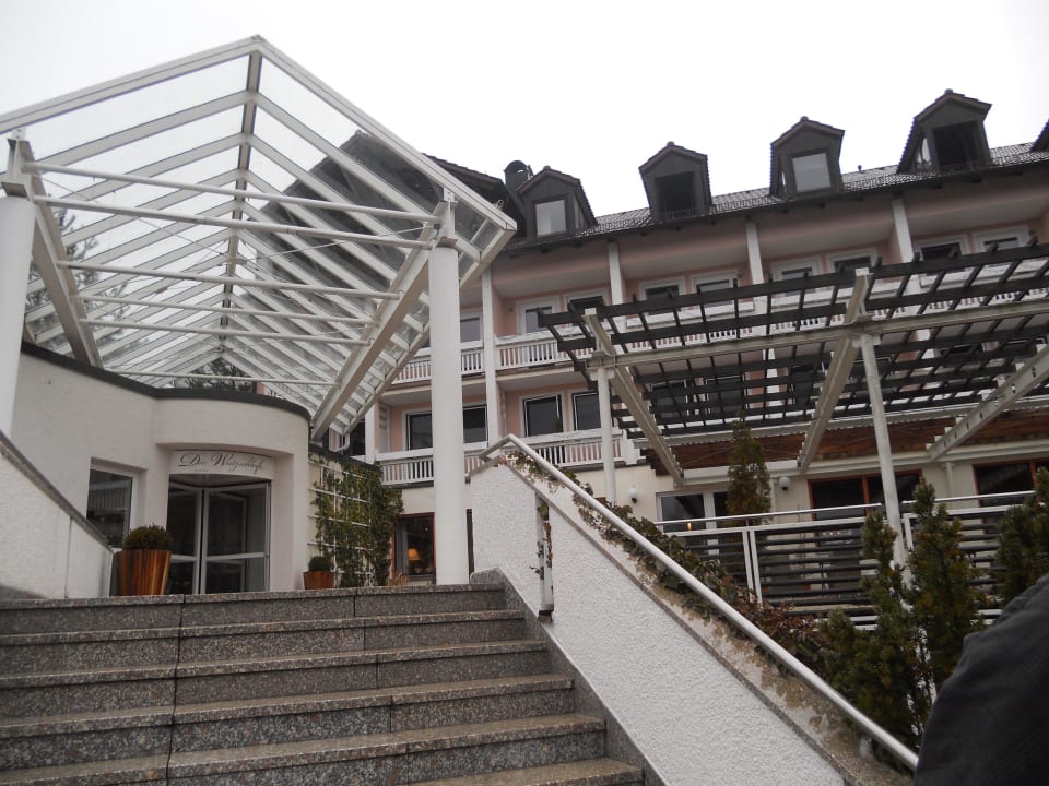 Hoteleingang, rechts Balkone der Zimmer