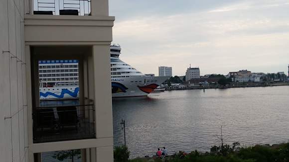 Blick vom Balkon auf auslaufende "Aida"