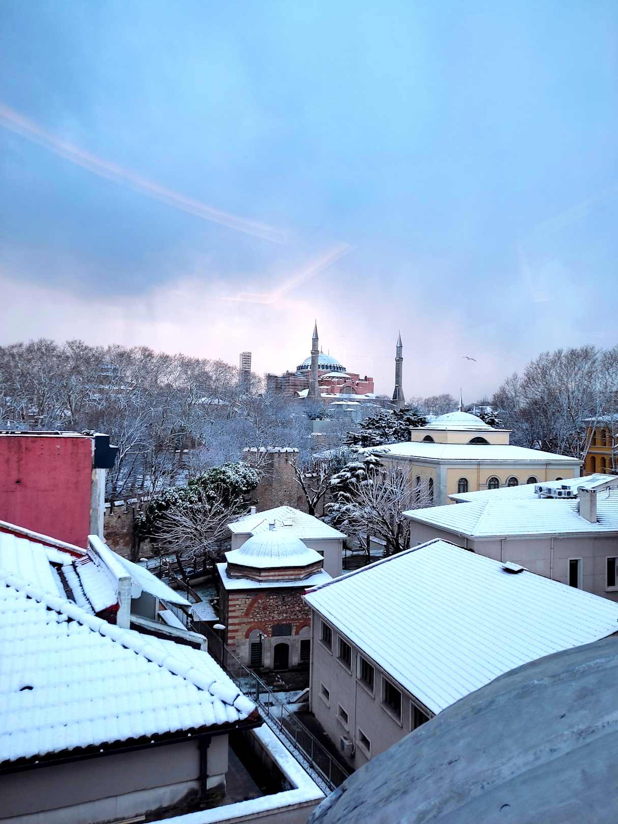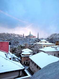 Oder Blick beim Frühstück auf die Hagia Sofia, diesmal sogar mit Schneehaube