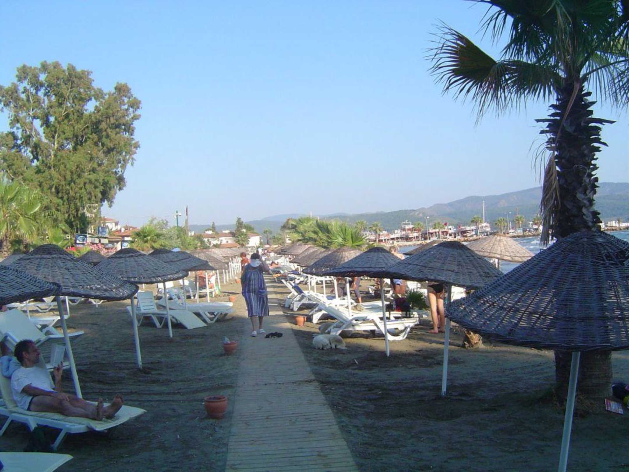 Strand am Hotel, Liegen mit Auflagen für Hotelgäste gratis. Holzplattenweg parallel zur Promenade / Ufer. Aufgenommen gegen 19 Uhr, tagsüber ist es hier voller!