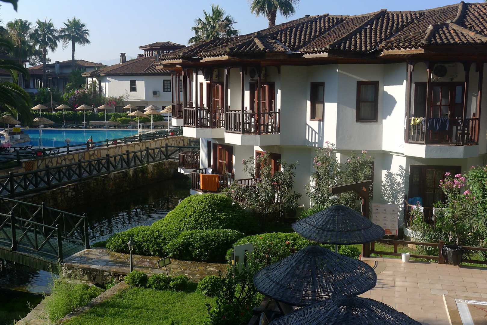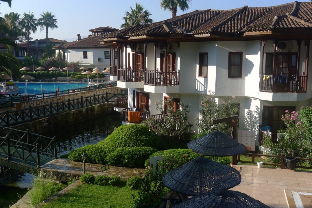 Die abgebildeten Gebäude gehören zum Hotel, die Fläche unten rechts gehört zu einem Pool. Unter der Brücke links ist der Bach aufgestaut.