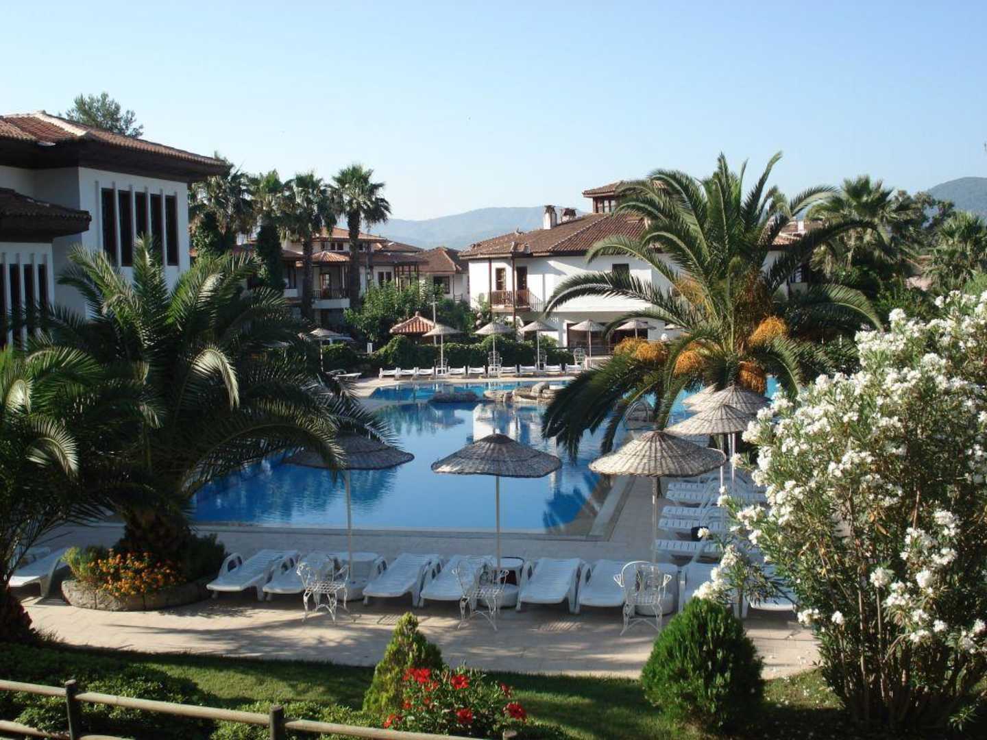 Hotel-Pool morgensAussicht aus unserem Familienzimmer frühmorgens. Hotel Yücelen in Akyaka/Gökova-Bucht, türkische Ägäis.