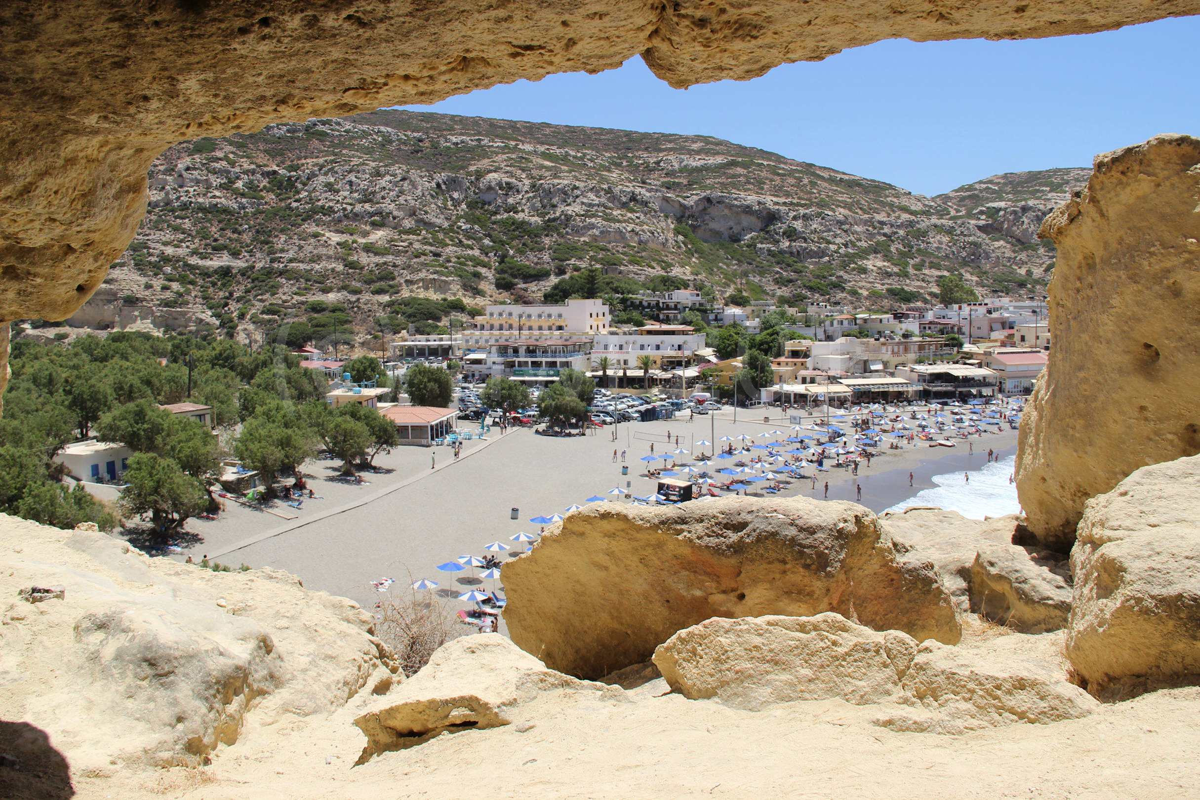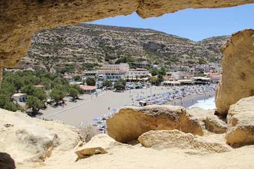 Der Strand von Matala mit dem Hotel Zafiria