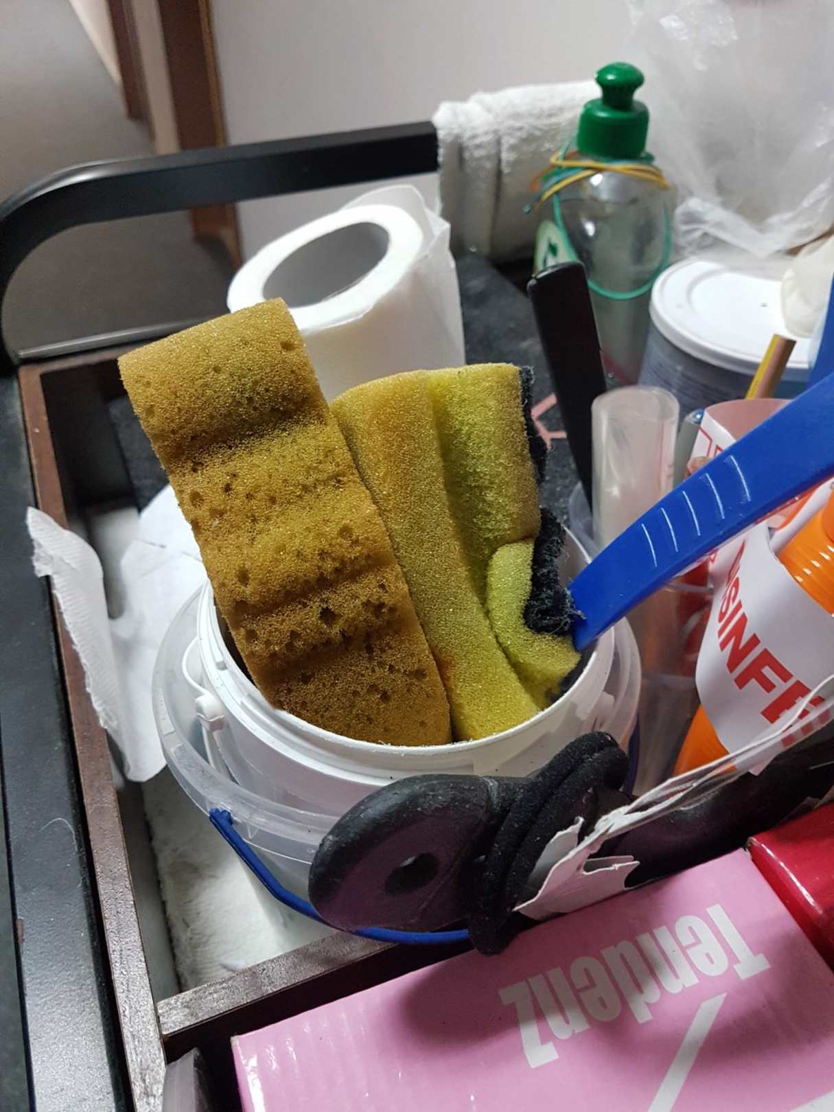 ZimmerBereits verfärbter Putzschwamm des Zimmer"service". So verbreitet man Bakterien von Zimmer zu Zimmer!