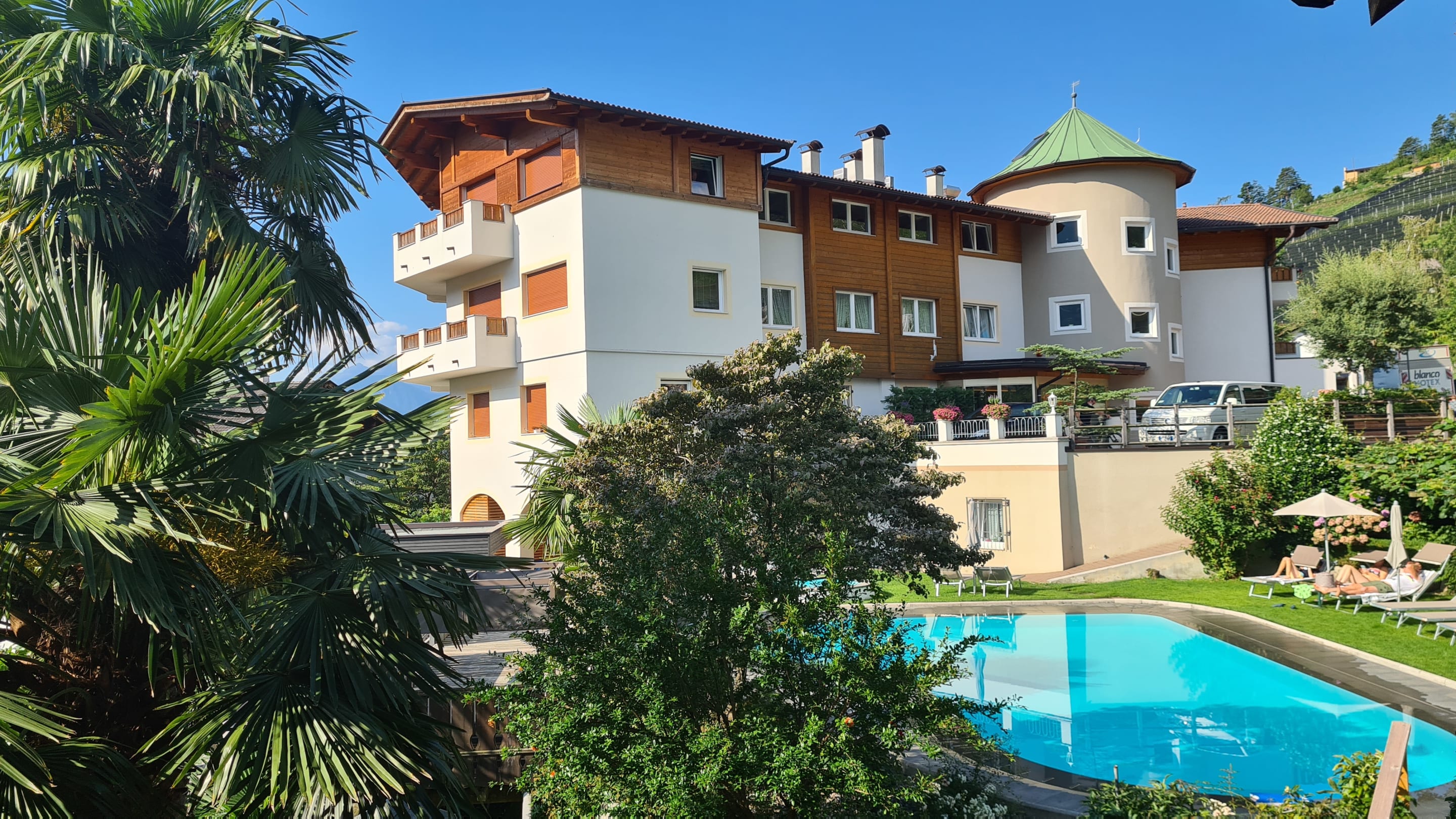 Blick vom Nebengebäude auf das Haupthaus mit Poolanlage