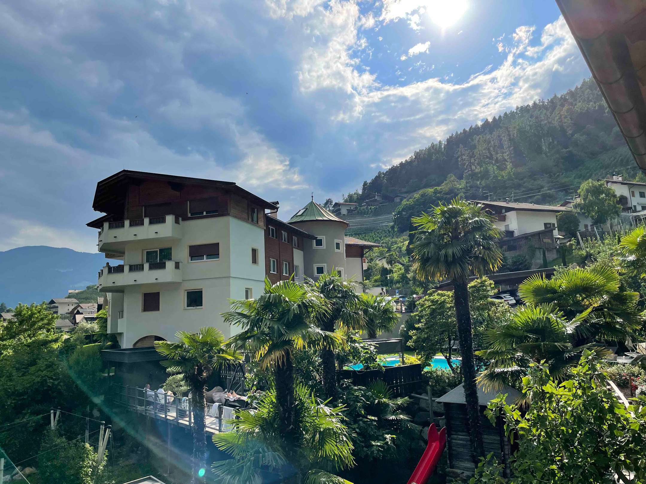 Hotel Zirmerhof mit Garten, Palmen, Außensauna, Pool. Von der Residenz aus fotografiert.
