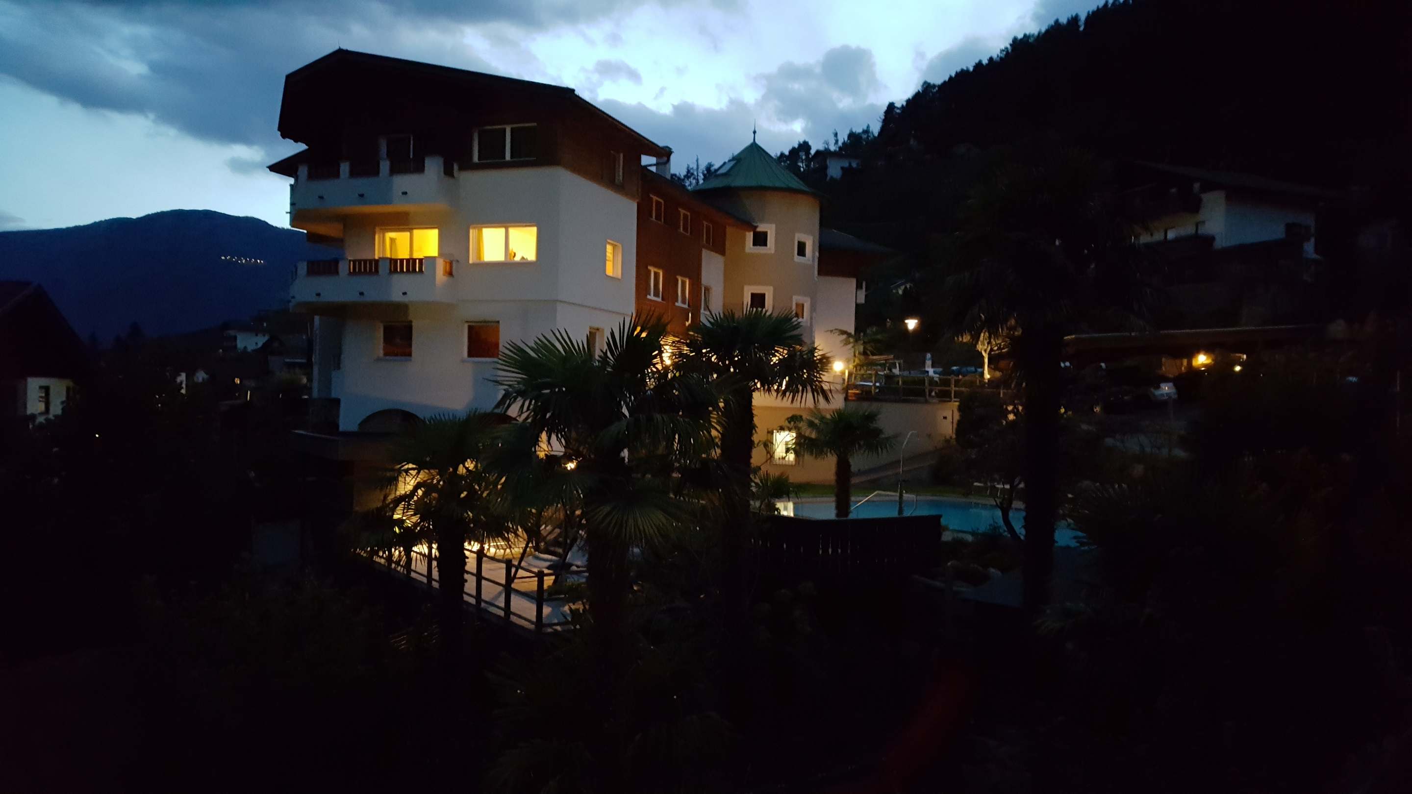 Hotel hat 3 Häuser. Hauptgebäude ist hier am Abend zu sehen. Genommen vom unserem Balkon. Pool ist auch sichtbar. Weitere Infos auf deren Webseite.