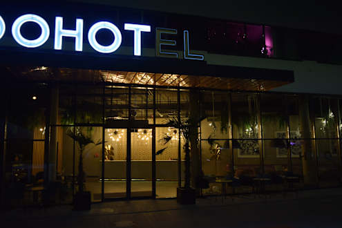 Eingang bei Nacht. Oben drüber "pink" beleuchtet: Das Restaurant.