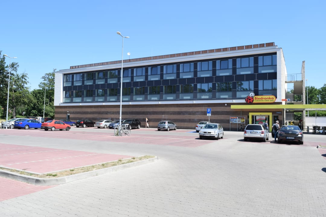 Das Hotel ist in den beiden oberen Stockwerken des Gebäudes untergebracht. Unten befindet sich ein Biedronka Supermarkt der bis spät in die Nacht geöffnet war...