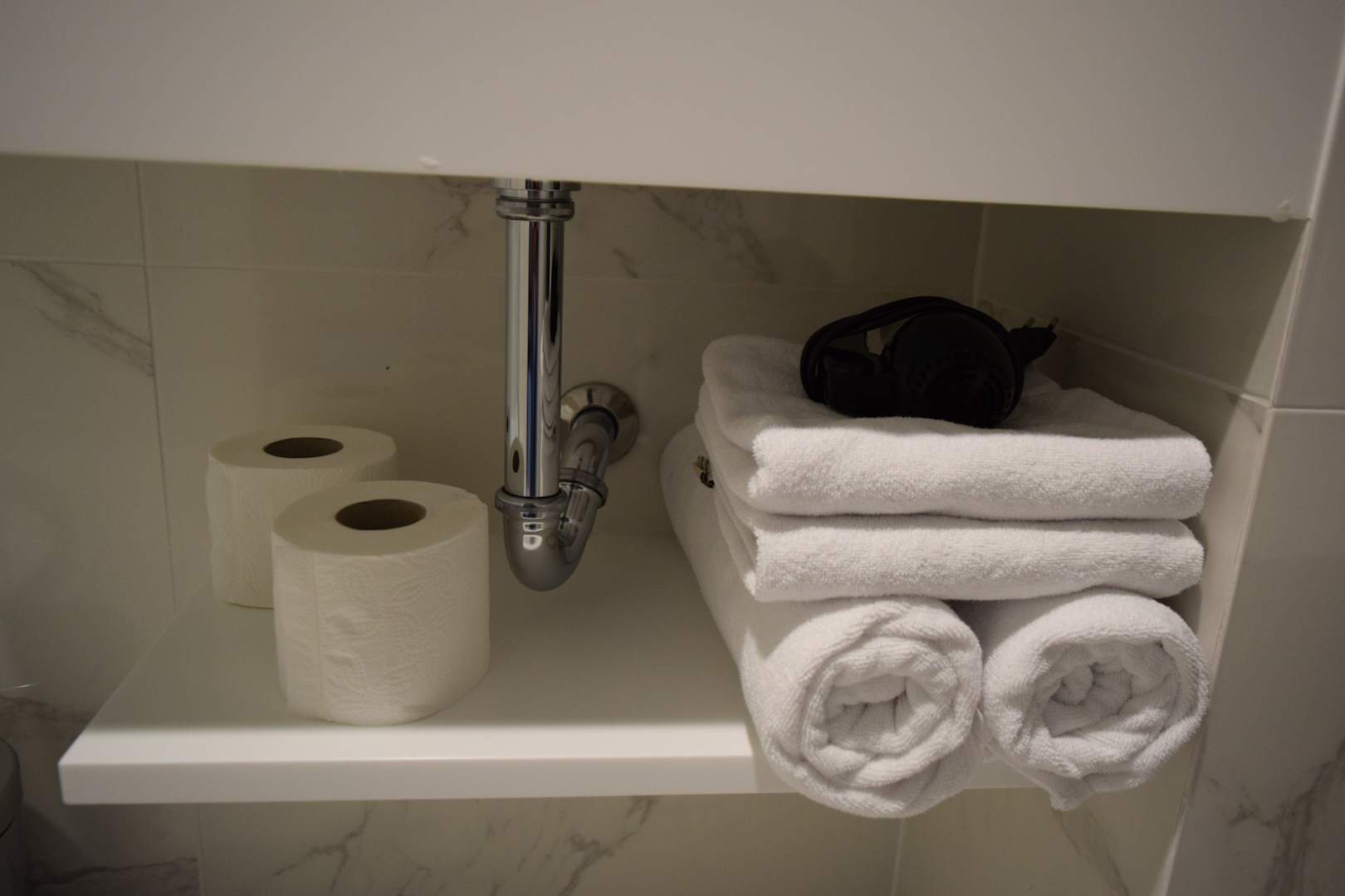 Handtücher, WC-Papier, Haartrockner unter dem Waschbecken im Badezimmer. Auf den Handtüchern stand übrigens NICHT Zoo Hotel, sondern Absynth Apart...