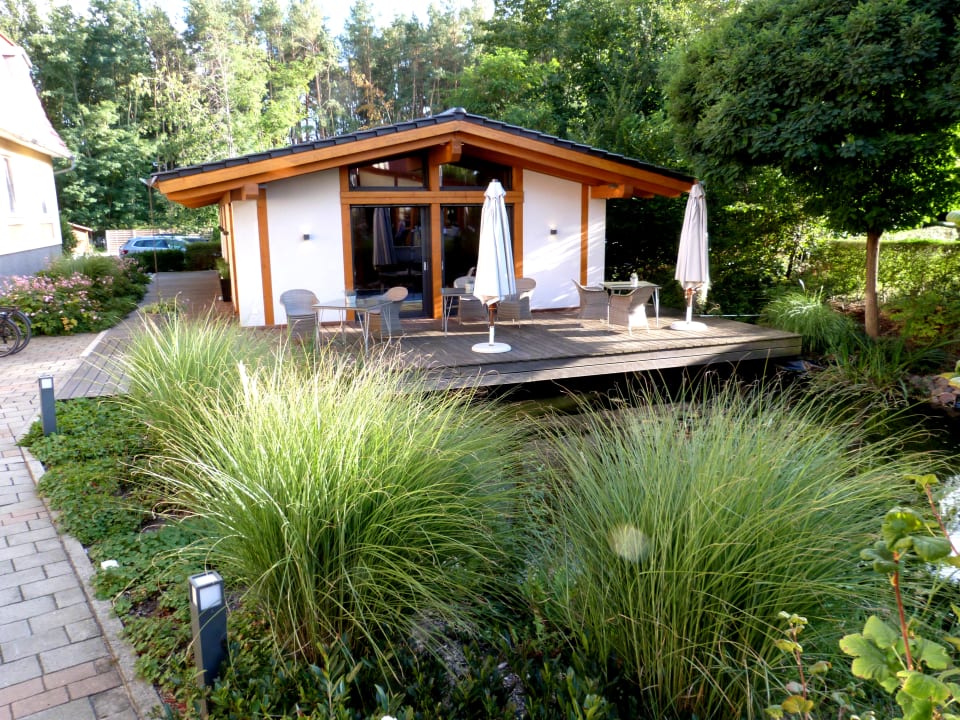 Das Poolhaus vom Biergarten aus gesehen