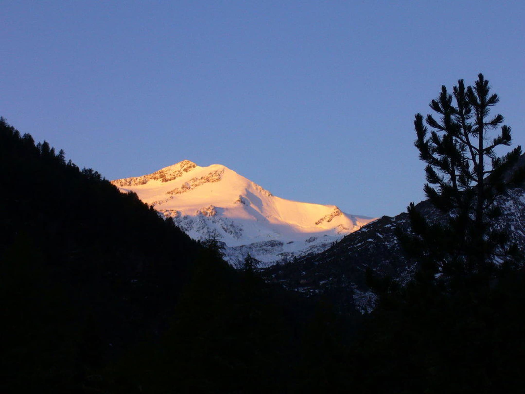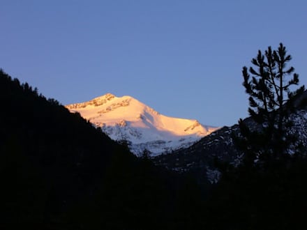 Blick auf ZufrittgletscherDiesen Ausblick hat man von den Balkons auf der Zugangsseite des Hotels. Es zeigt den Zufrittgletscher bei Sonnenaufgang.