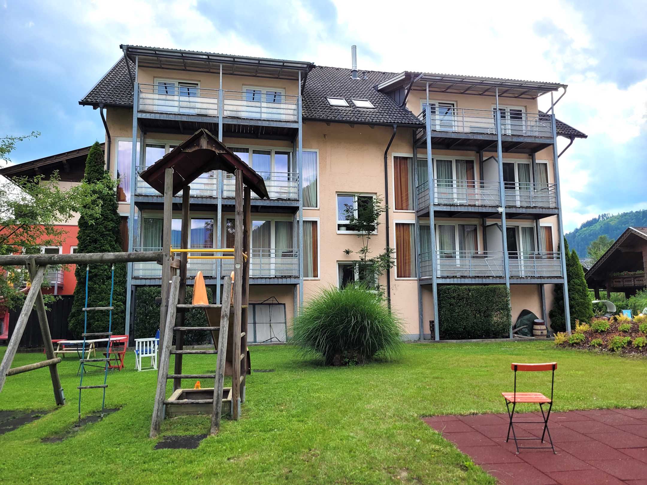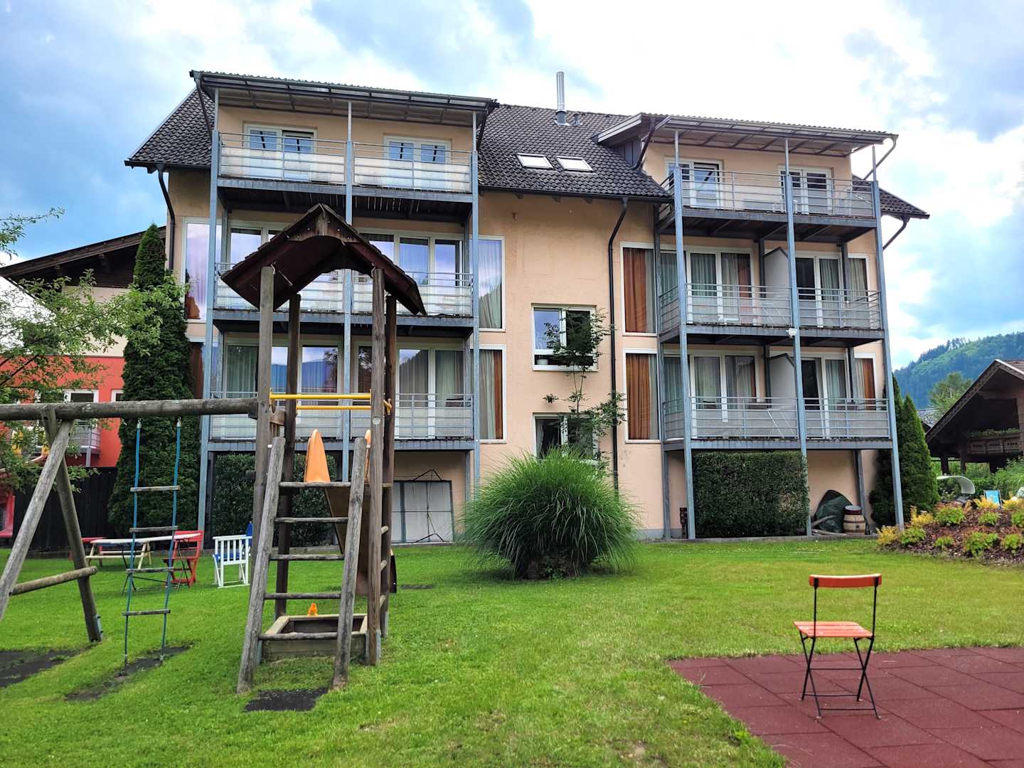 Von der Rückseite mit Spielplatz