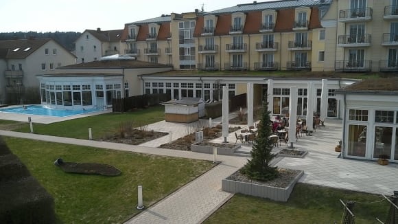 Blick vom Zimmer auf Pools und Wellnessbereich