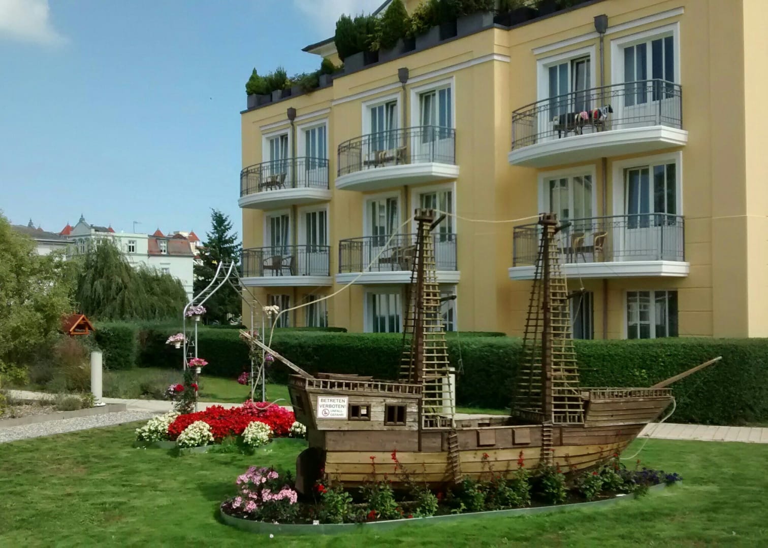 Blick zu einer der Villen im Garten