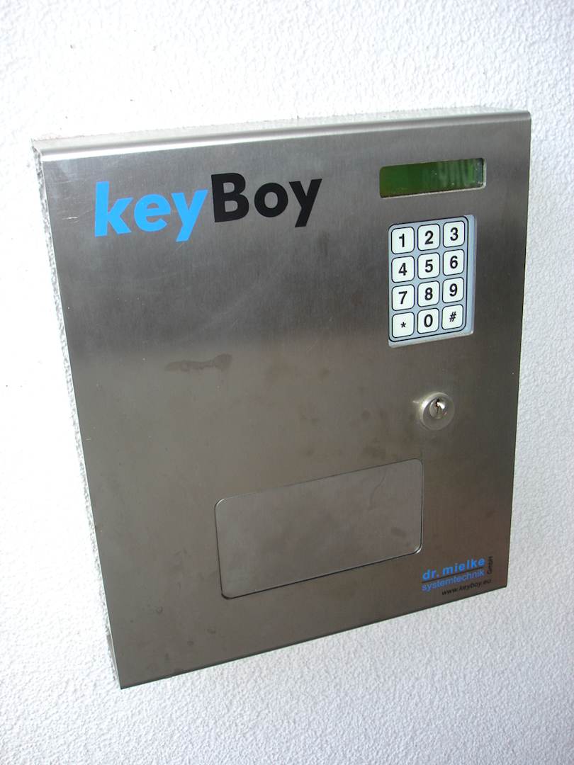 An der Aussentür des Hotels erhält man mit einem Code den Zimmerschlüssel aus diesem Automaten, wenn man zu Zeiten anreist, zu denen die Rezeption nicht mehr besetzt ist