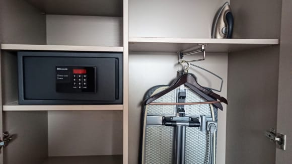 Sogar ein Safe und Bügeleisen und Brett