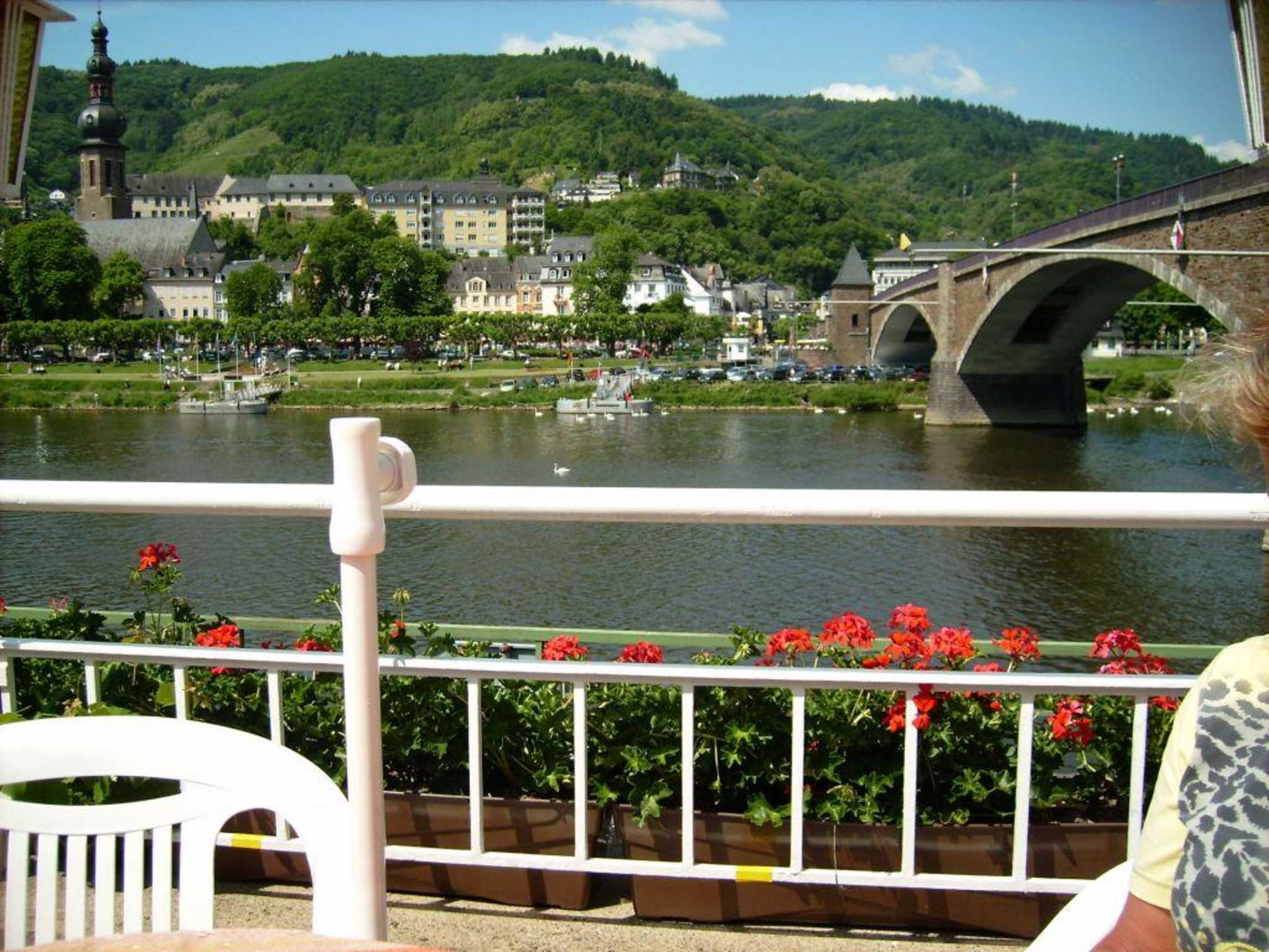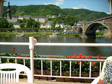 Blick von der Terrasse entlang der alten Moselbrücke zur Promenade